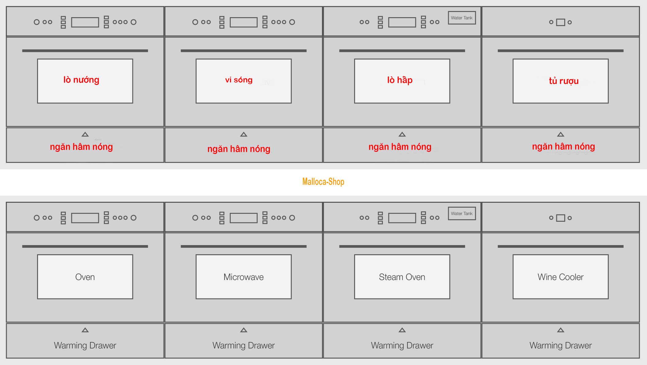 4. Bộ Compact 4 : Bộ Compact sắp xếp theo chiều ngang : lò nướng + lò vi sóng + lò hấp + tủ bảo quản rượu + ngăn hâm nóng thức ăn. Đây được xem là bộ Compact đầy đủ nhất dành cho không gian bếp có diện tích rộng