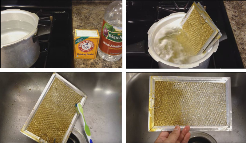 Sau khi tháo lưới lọc mỡ chúng ta có thể ngâm qua nước lạnh hoặc tốt nhất là nước ấm để những vết mỡ bám lâu ngày dễ dàng chảy ra sau đó dùng các loại xà bông, nước rửa chén thông thường chà sạch ( lưu ý đừng quá mạnh tay vì lưới lọc mỡ thường được làm bằng hợp kim nhôm ). Sau đó phơi khô và lắp lại vào máy hút, ngoài ra bạn có thể dùng dung dịch Baking Soda để làm sạch bằng cách : Pha 1 lít nước với 1/2 cốc Baking Soda cho tấm lưới lọc và hỗn hợp dung dịch này rồi đun sôi khoảng 20 -30 phút cho đến khi tấm lưới lọc sạch sẽ, rồi rửa lại bằng nước rửa chén thông thường