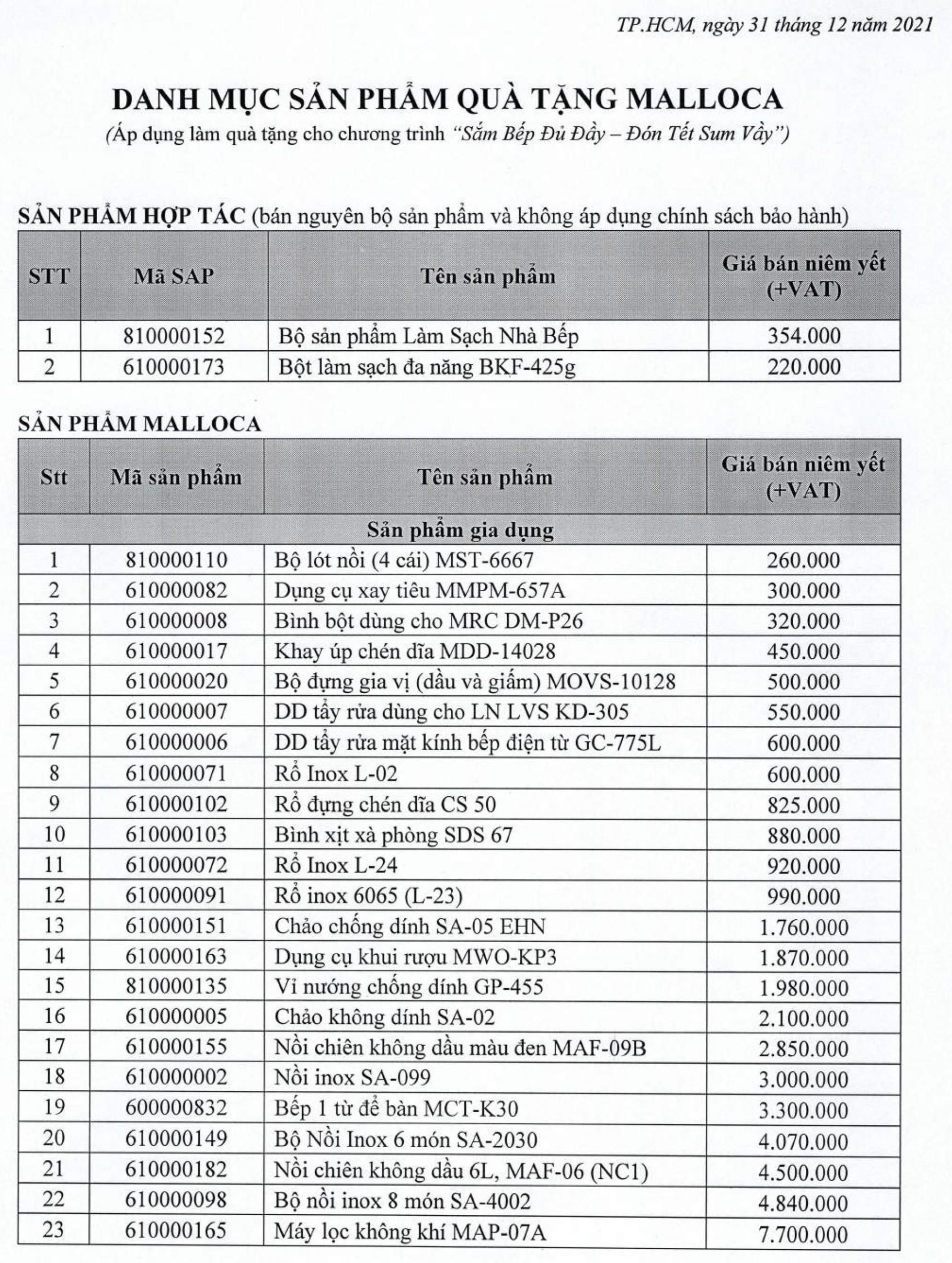 Danh mục quà tặng cho chương trình khuyến mãi Malloca dành cho tháng 1 năm 2022