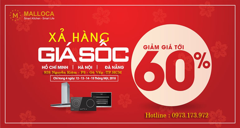 Thể lệ chương trình : Khách hàng khi mua các sản phẩm chính hãng Malloca tại hệ thống Malloca Shop kể từ ngày 12/01/2018 đến hết ngày 15/01/2018. Khách hàng được giảm giá sốc lên đến 60% theo giá cataog mới nhất . Các sản phẩm được lắp đặt miễn phí khu vực TPHCM và khu vực Hà Nội . Sản phẩm mua tại Malloca Shop được bảo hành chính hãng 3 Năm tại nhà khách hàng