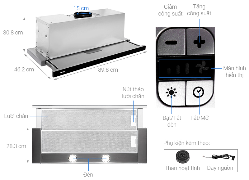 - Chế độ hút và khử mùi trực tiếp bằng than hoạt tính hoặc thoát ống ra ngoài, đường kính ống thoát 150 mm