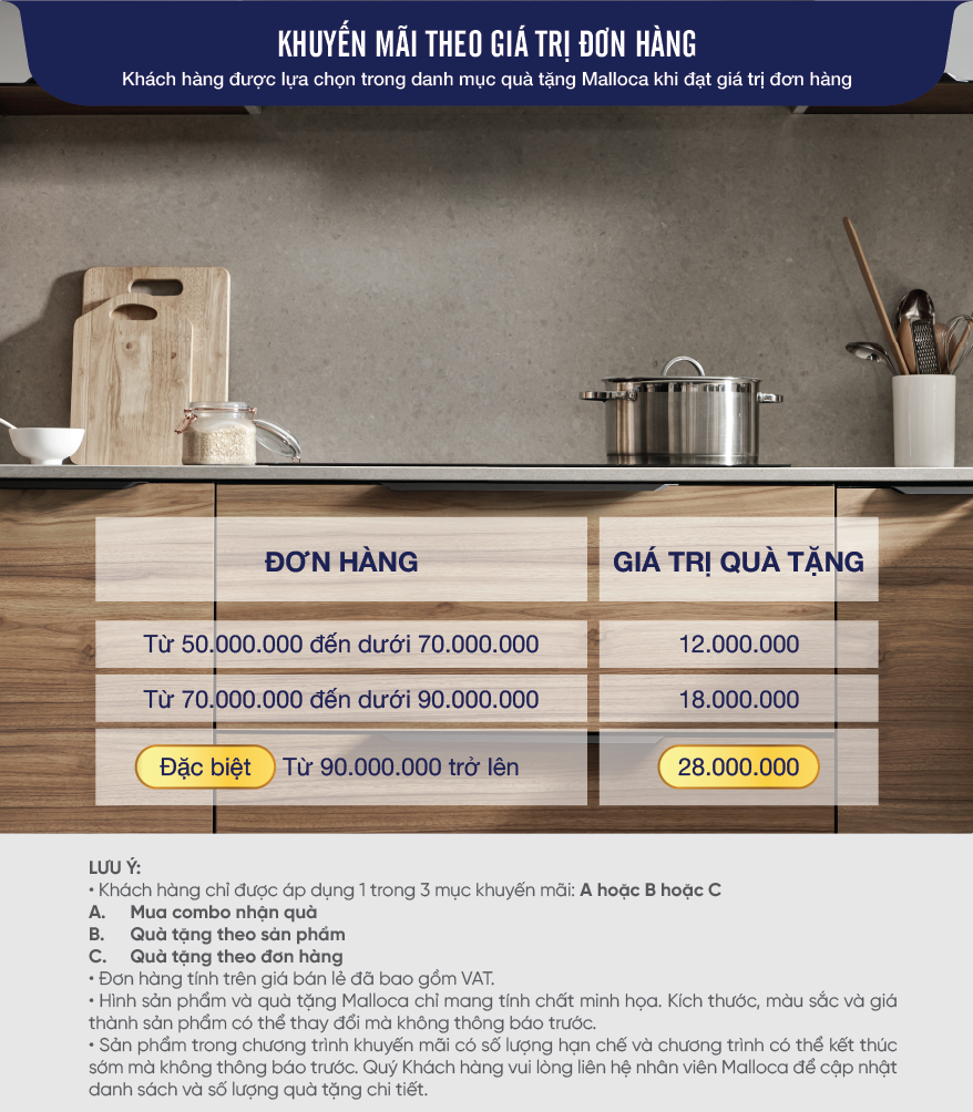 + Khách hàng được lựa chọn quà khuyến mãi khác nhau trong danh mục quà tặng Malloca sao cho phù hợp nhu cầu khách hàng, và khi trường hợp giá trị quà tặng lựa chọn lớn hơn giá trị quà khuyến mãi, khách hàng phải bù thêm tiền mặt ( Xem chi tiết danh mục quà tặng Malloca tại đây )