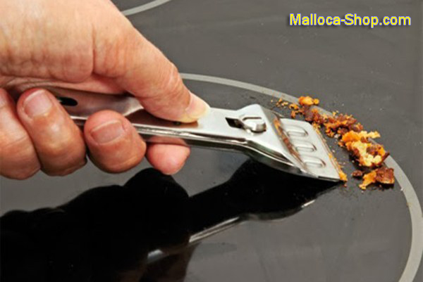 Với những vết bẩn dính chặt vào kính như keo, sáp nến hay các chất có lượng đường cao dính trên bề mặt bếp điện ....không thể lau sạch bằng các cách thông thường cũng như các chất tẩy rửa chuyên dụng. Thì khách hàng có thể sử dụng dao cạo chuyên dành cho bếp điện từ, bếp từ ...bằng cách lau sơ qua mặt kính , sau đó dùng dao cạo kim loại đặt nghiêng 30 độ so với mặt kính và đẩy nhẹ cho đến lúc vết bẩn không còn bám trên bề mặt . Lưu ý không chà xát mạnh lên khu vực bàn phím bếp